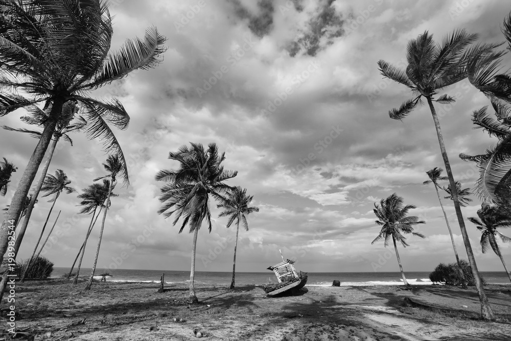 Black and white scenery of fisherman village with coconut tree, boat and beach.