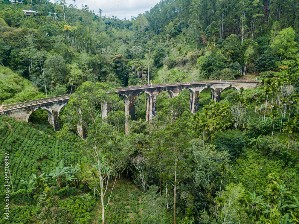 Old railway in the jungle. Aerial View. Nine Arches Bridge is located in Demodara, Ella city, Sri Lanka.