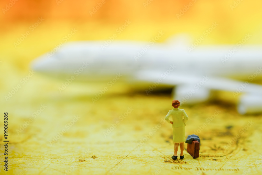 Business and global worldwide concept. Businesswoman miniature figure with suitcase and jacket standing on world map with airplane toy model as background