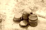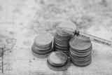 Close up of insulin syringe for control blood sugar level on stack of coins with world map as background using as Medicine, diabetes, glycemia, health care and money concept.
