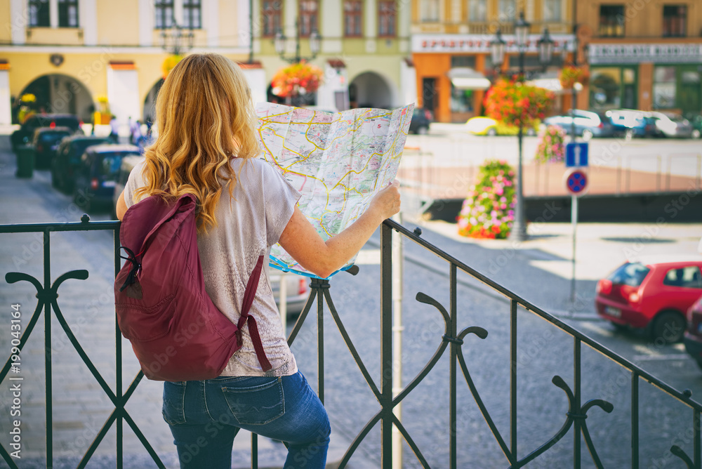 Woman tourist with a map standing on stairs in a historic european city