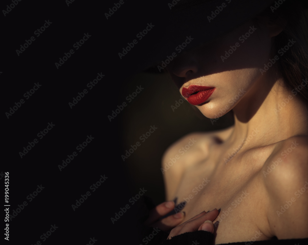 Elegant woman with red lips. elegant woman with naked shoulders on black background, copy space
