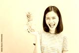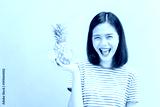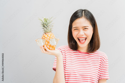 Young girl happy smile and cheerful in red dress and hold two pineapple in hand. Concept summer travel.
