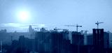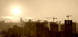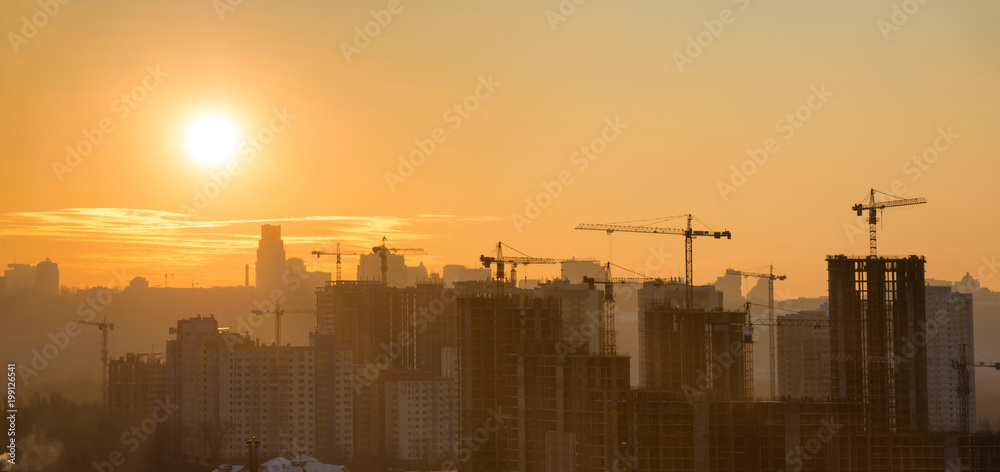 Panorama of sunset in the city with silhouette of buildings and industrial cranes
