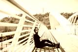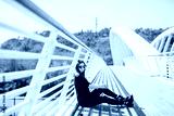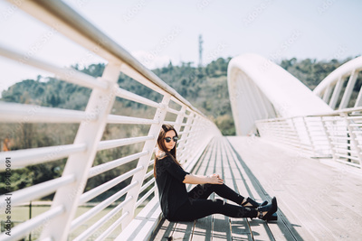 Teenage girl beautiful in the floor of a bridge in the city