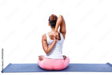 Young indian woman in yoga pose in white clothes isolated on white background.