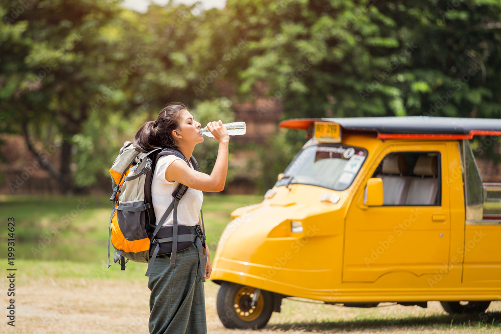 Young asian female traveler is drinking water with refreshing on the old temple background, Ayutthaya Province, Thailand