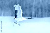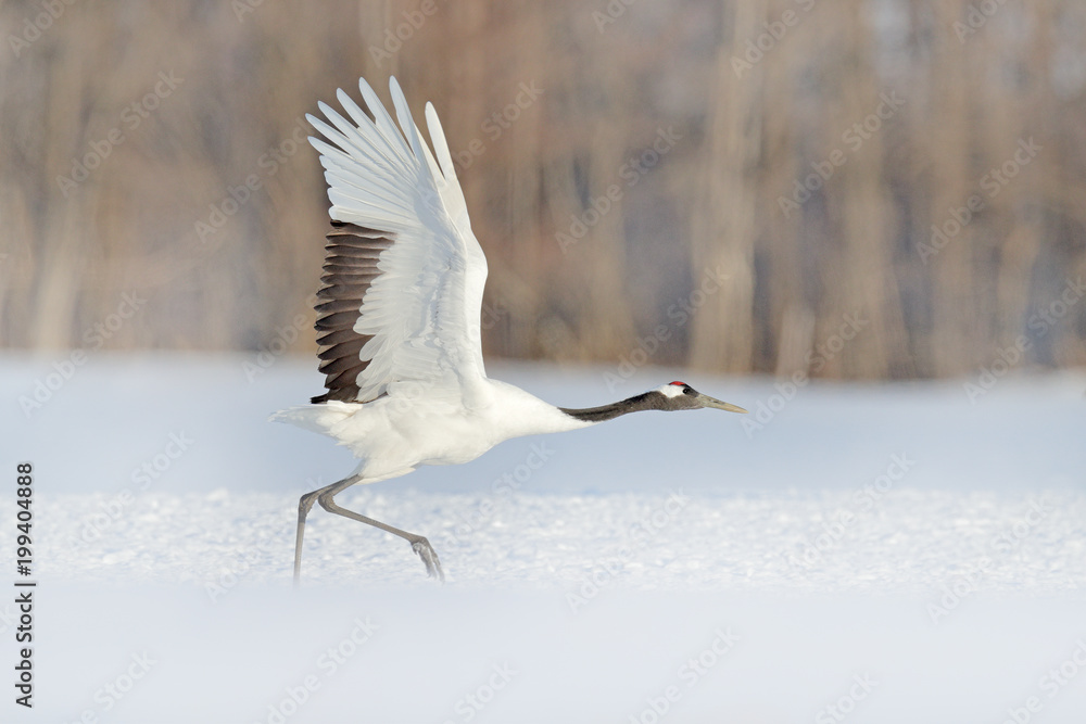 Start Red-crowned crane in snow meadow, with snow storm, Hokkaido, Japan. Bird in fly, winter scene with snowflakes. Snow dance in nature. Wildlife scene from snowy nature. Cold winter. Snowy.