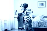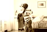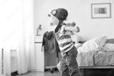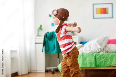 childhood, imagination and dream concept - happy little boy in pilot hat playing game at home