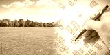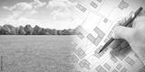 Planning a new city - concept image with hand drawing an imaginary cadastral map of territory with buildings, fields and roads against a green area