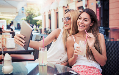 Friends meeting in a cafe. Young women drinking lemonade and have fun with tablet. Consumerism, lifestyle concept
