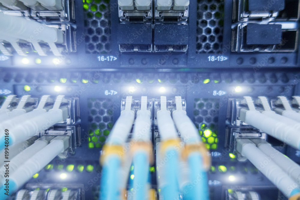 Fiber optic equipment in a data center. Close up fiber optic cable.