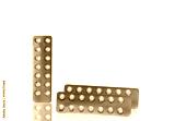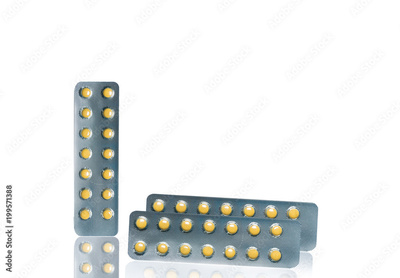 Small round light yellow enteric-coated tablet pills in blister pack isolated on white background with copy space. Medicine for treatment gastric ulcer (stomach ulcer) or GERD.