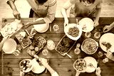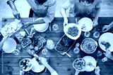 thanksgiving day, eating and leisure concept - group of people having dinner at table with food