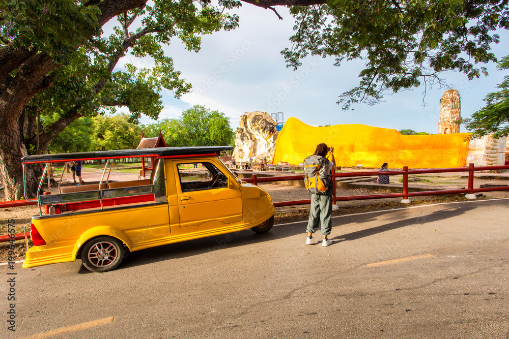 Young asian woman traveler with backpack traveling taking photos big reclining buddha statue at Wat Lokayasutharam, Ayutthaya Province, Thailand