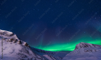 The polar arctic Northern lights aurora borealis sky star in Norway Svalbard in Longyearbyen city man mountains