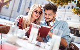 Dating. Young couple drinking coffee in the cafe. Education, relationships, love, lifestyle concept