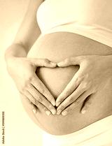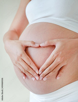 Close-up Pregnant woman hands in a heart shape on her tummy.