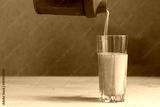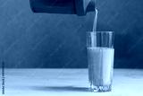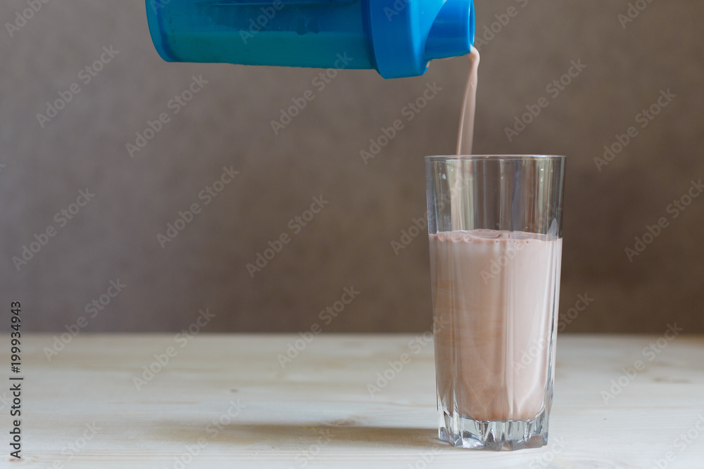 Ready milk whey cocktail protein drink is poured from a shaker into a glass Cup. Sports drink for a set of pure muscle mass. Hand holding plastic shaker with protein shake and glass on table