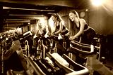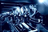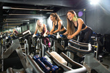 Cheerful sporty girls riding fitness bikes on cycling class.