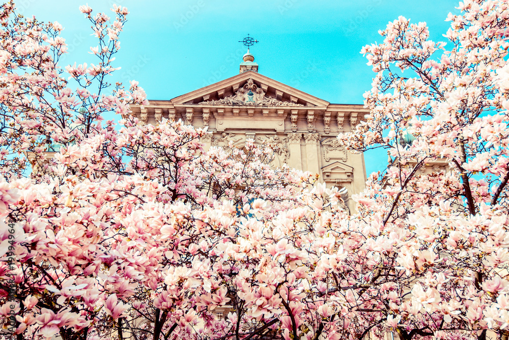 magnolia magnolia - pink magnolia blossoms and church in a urban park Milan italy
