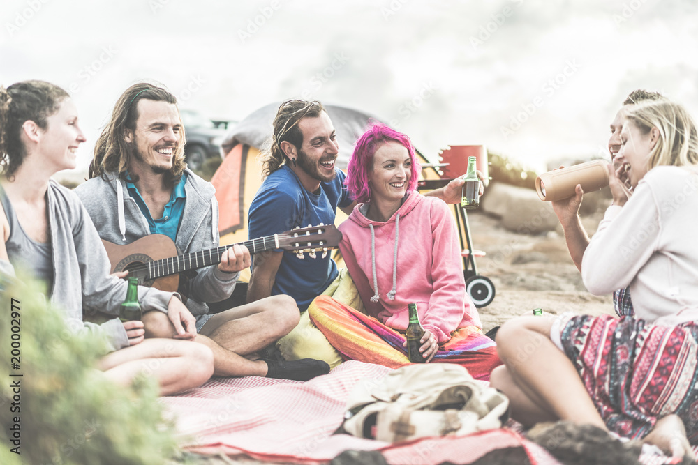 Happy friends having barbecue picnic party on the beach