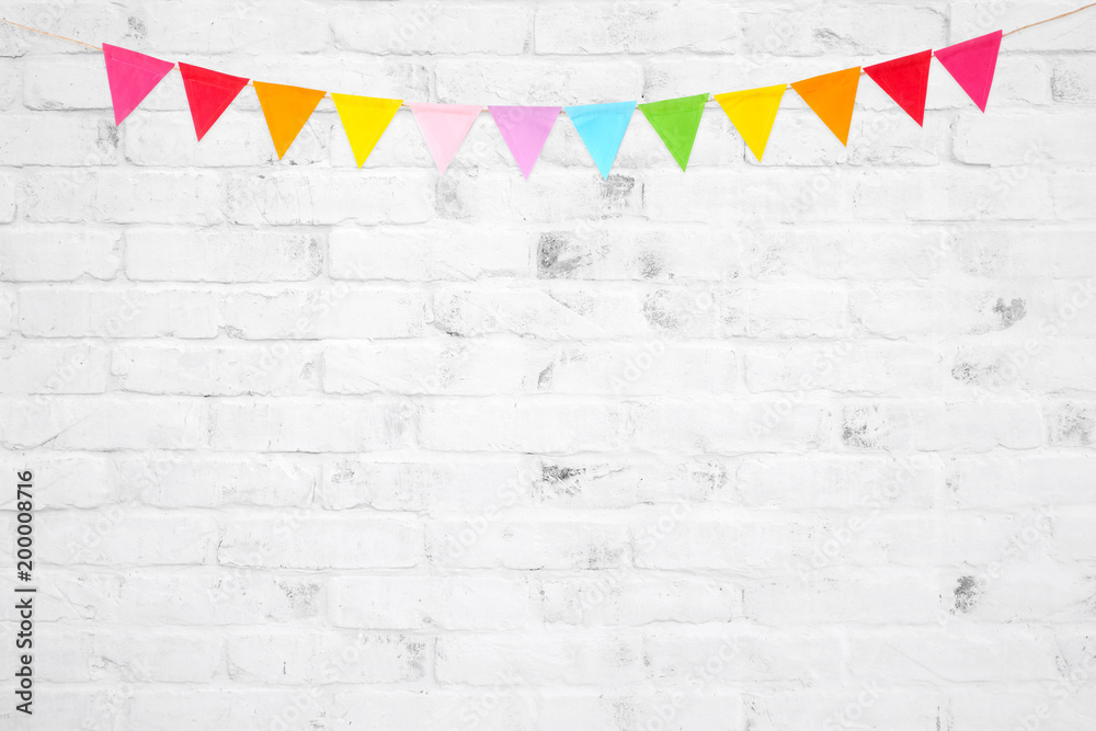 Colorful party flags hanging on white brick wall background, birthday, anniversary, celebrate event, festival greeting card background
