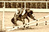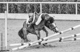 Young rider falling from horse during a competition. Horse show jumping accident. Equestrian sport background.