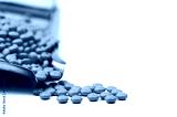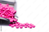 Pile of pink round sugar coated tablets pills on drug tray with copy space. Pills for treatment anti anxiety, antidepressant and migraine headache prophylaxis. Healthcare in seniors or older people