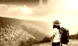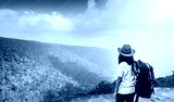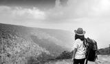 Young traveling woman with backpack and hat stand on the top of the mountain cliff watching beautiful view of woods and sky after rain on her vacation. Asian woman travel alone.