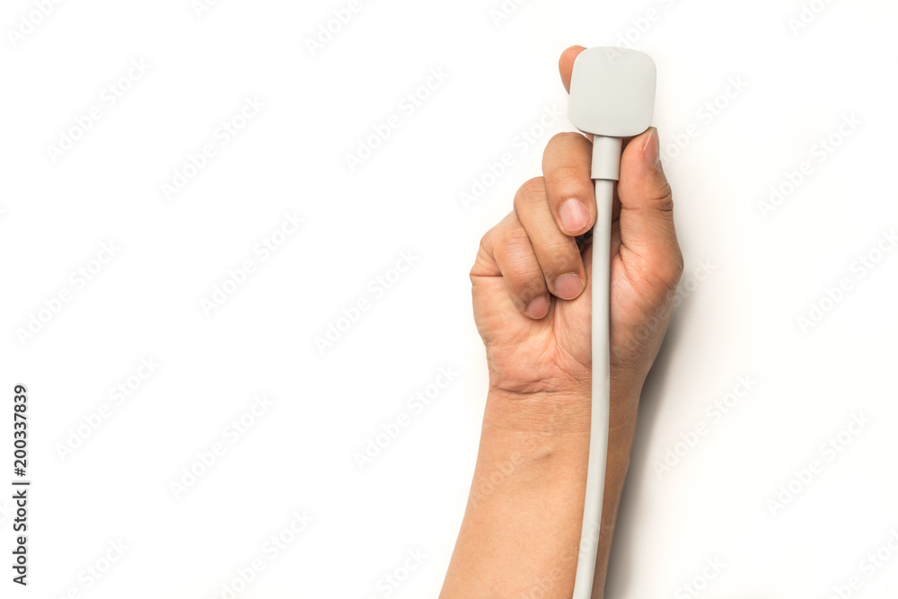 hand hold plug electric power white color wire. save energy and reduce energy efficiency concept