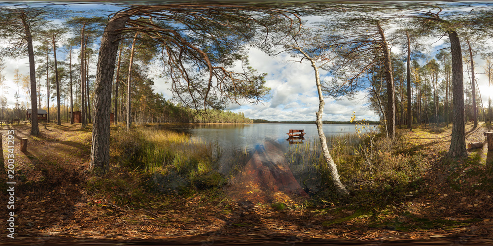 Lake in the forest with a bench. Full 360 degree panorama