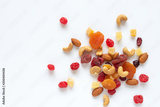 healthy snack: mixed nuts and dried fruits on white background from above, almond, pineapple, cranberry, papaya, apple, strawberry, cherry, apricot, casshew.
