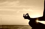 Hand meditating against ocean sunset.