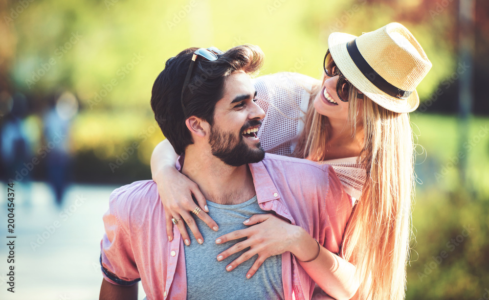 Meeting in the park. Romantic couple having fun in the city park. Love, dating, romance
