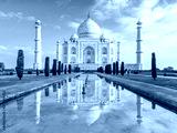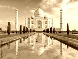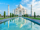 Amazing view on the Taj Mahal in sunset light with reflection in water. The Taj Mahal is an ivory-white marble mausoleum on the south bank of the Yamuna river. Agra, Uttar Pradesh, India.