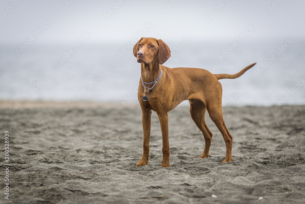 little hunting dog Hungarian Vizslaa playing on the sand on the beach and having fun and posing.young puppy relaxes and trains on the beach.