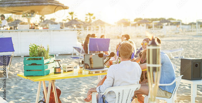 Group of young people making a video live streaming from beach party at sunset