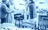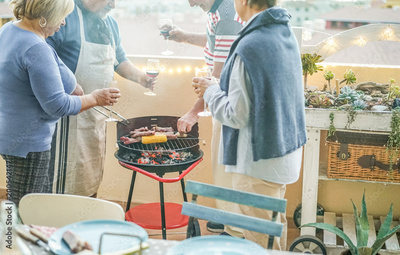 Senior friends having fun drinking wine at barbecue dinner in terrace outdoor