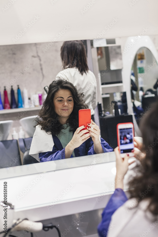 Young woman takes selfie with her smartphone in front of the mirror of a hairdresser's shop after cutting and styling