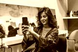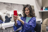 Young woman takes selfie with her smartphone in front of the mirror of a hairdresser's shop after cutting and styling