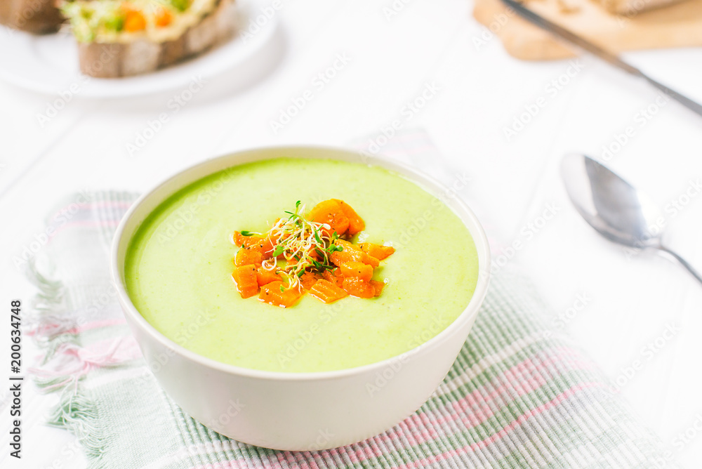 Bowl of Green peas cream soup with baked carrot and microgreen sprouts on the served white wooden table. Healthy food, vegitarian diet concept. Selective focus, space for text.