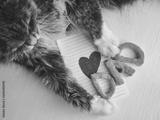 Lovely cat's paws, greeting card with painted, red heart, word DAD on white, isolated background. Congratulation to the father. Preparation for Father's Day