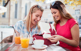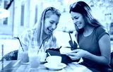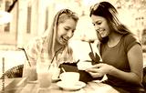 Two beautiful girls drinking coffee in the cafe after shopping. Consumerism, shopping, lifestyle concept