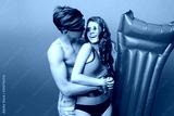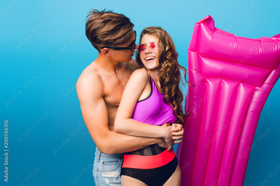 Young couple of handsome guy hugging pretty girl with long curly hair in swimsuit on blue background in studio. They wear sunglasses, girl is smiling to guy.