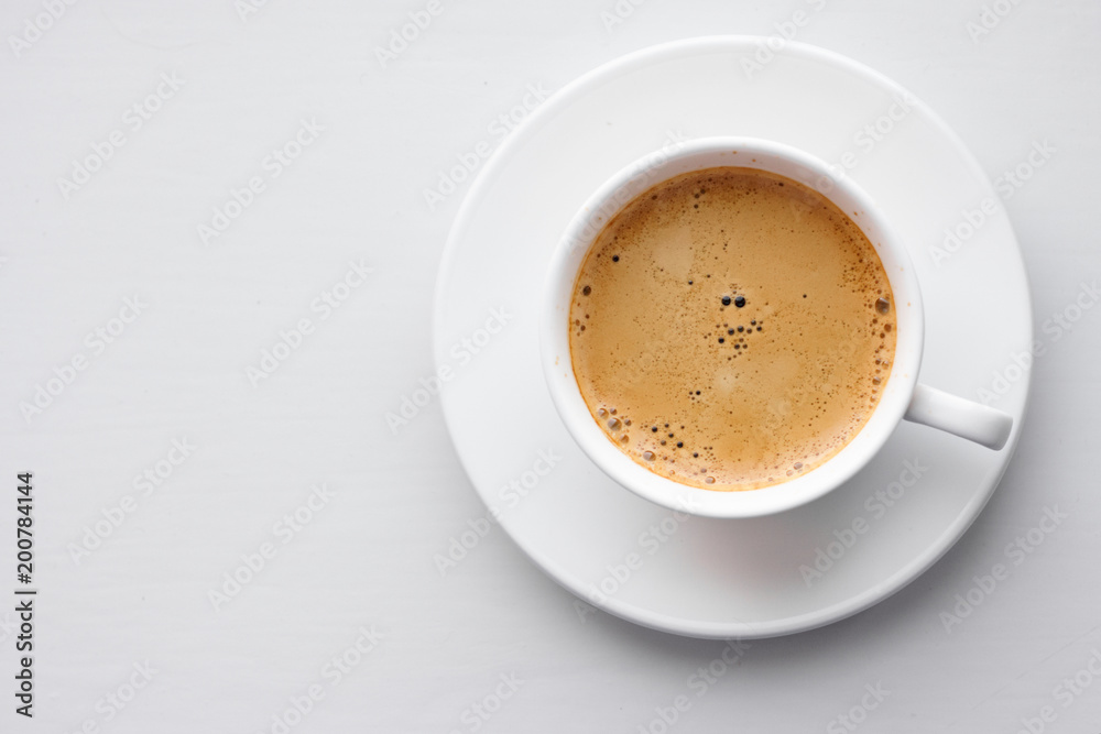 Coffee cup on saucer on white background. Top view with copyspace for your text