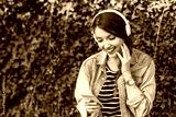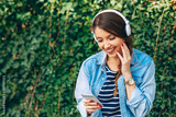 Young woman making video call via smartphone and headphones in the city