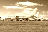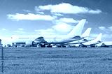 Row of passenger aircraft airplane parked at the airport, on service before departure.
