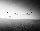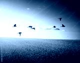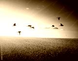 field of grass and flying birds