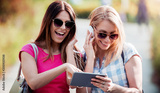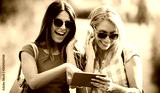 Two beautiful girls listening to music with tablet and headphones. Lifestyle, technology concept
